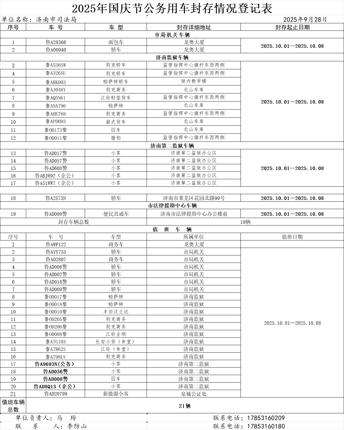 济南市司法局2025年国庆节公车封存信息